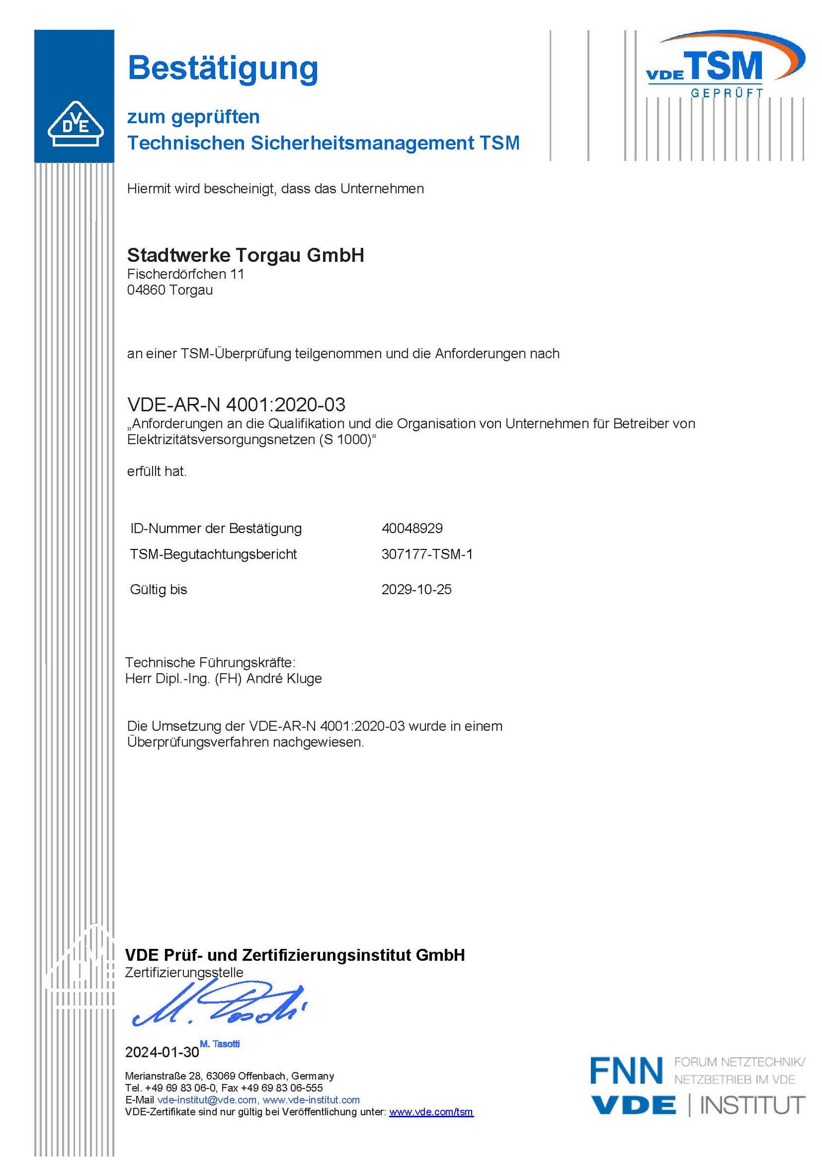 Die TSM-Zertifizierung erfolgt streng nach den hohen Anforderungen aus Gesetzen, Verordnungen, technischen Regelwerken und Sicherheitsvorschriften. Diese Zertifizierung bestätigt, dass die Kundinnen und Kunden der Stadtwerke Torgau sicher sein können, dass ihr heimischer Energieversorger bei Sicherheit und Service ausgezeichnete Arbeit leistet.
